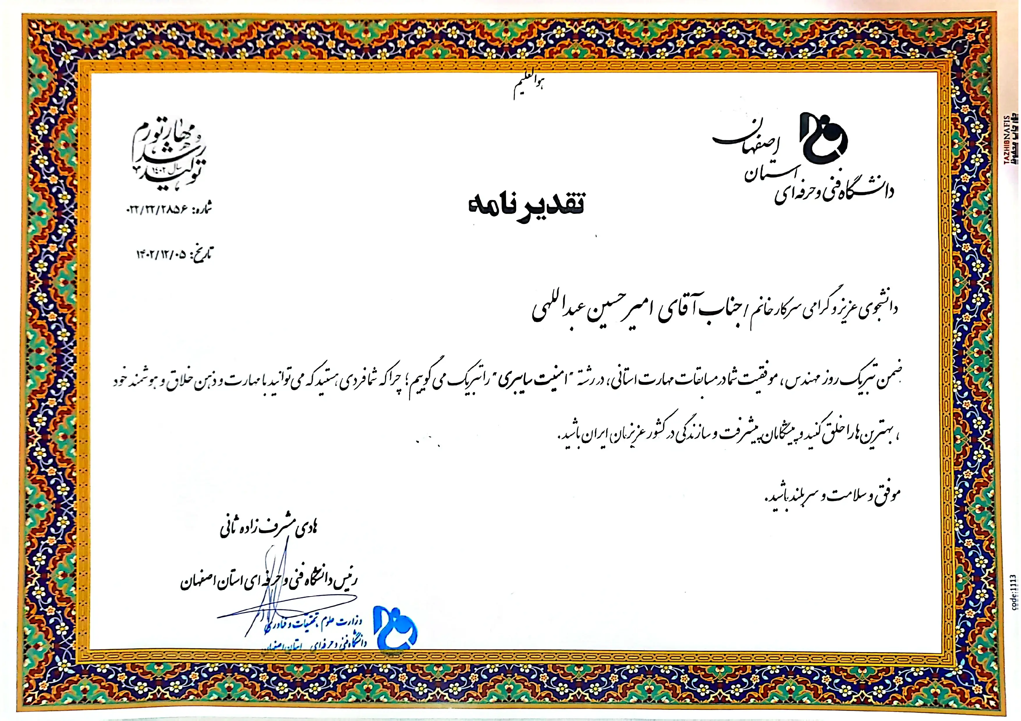 فارغ التحصیل رشته کاردانی شبکه از دانشگاه ملی مهارت (فنیوحرفهای سابق) شماره یک اصفهان، شهید محسن مهاجر